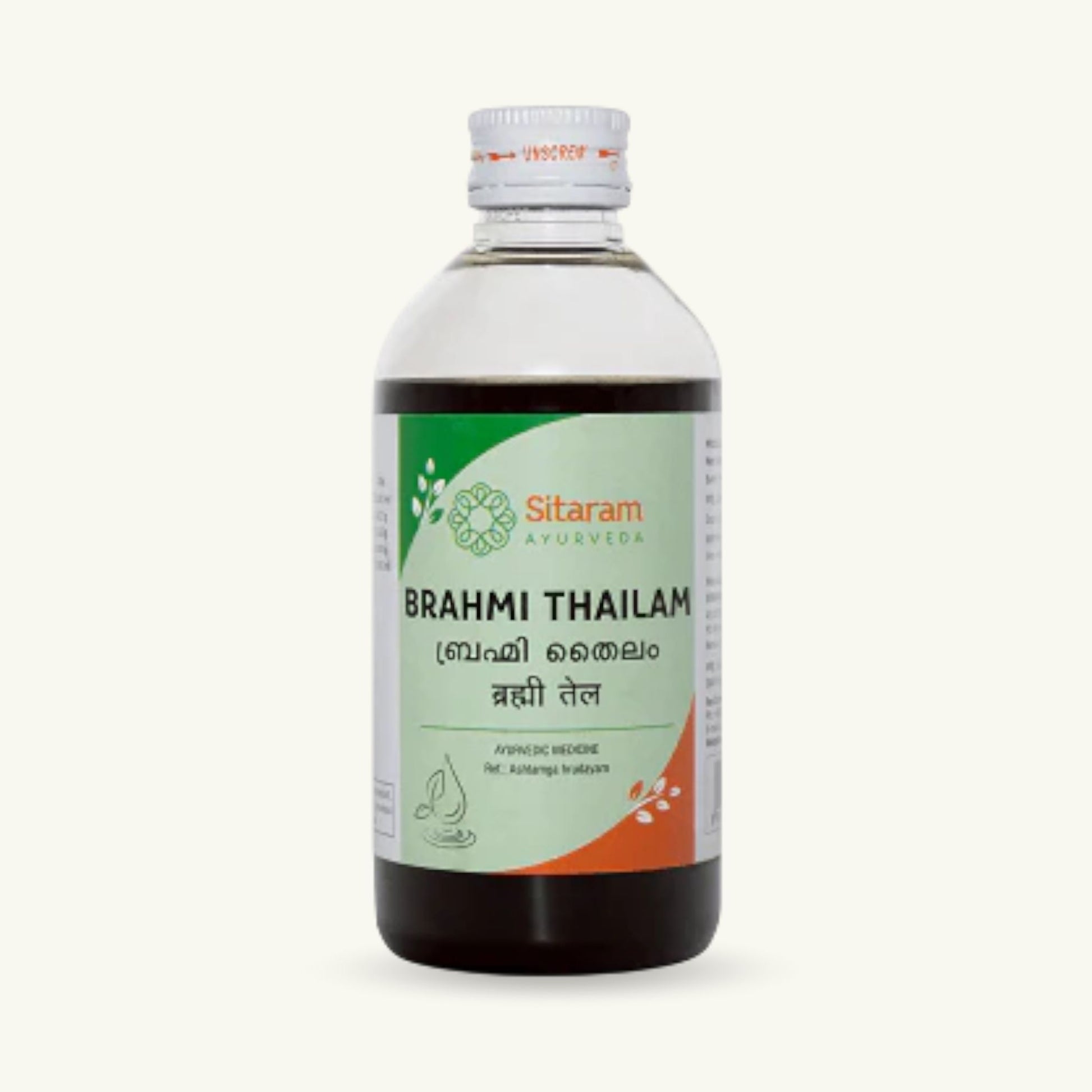 Brahmi Thailam is a classical Ayurvedic oil prepared for external application. It is made by processing Brahmi and other herbs in a traditional oil base using slow-cooking methods.