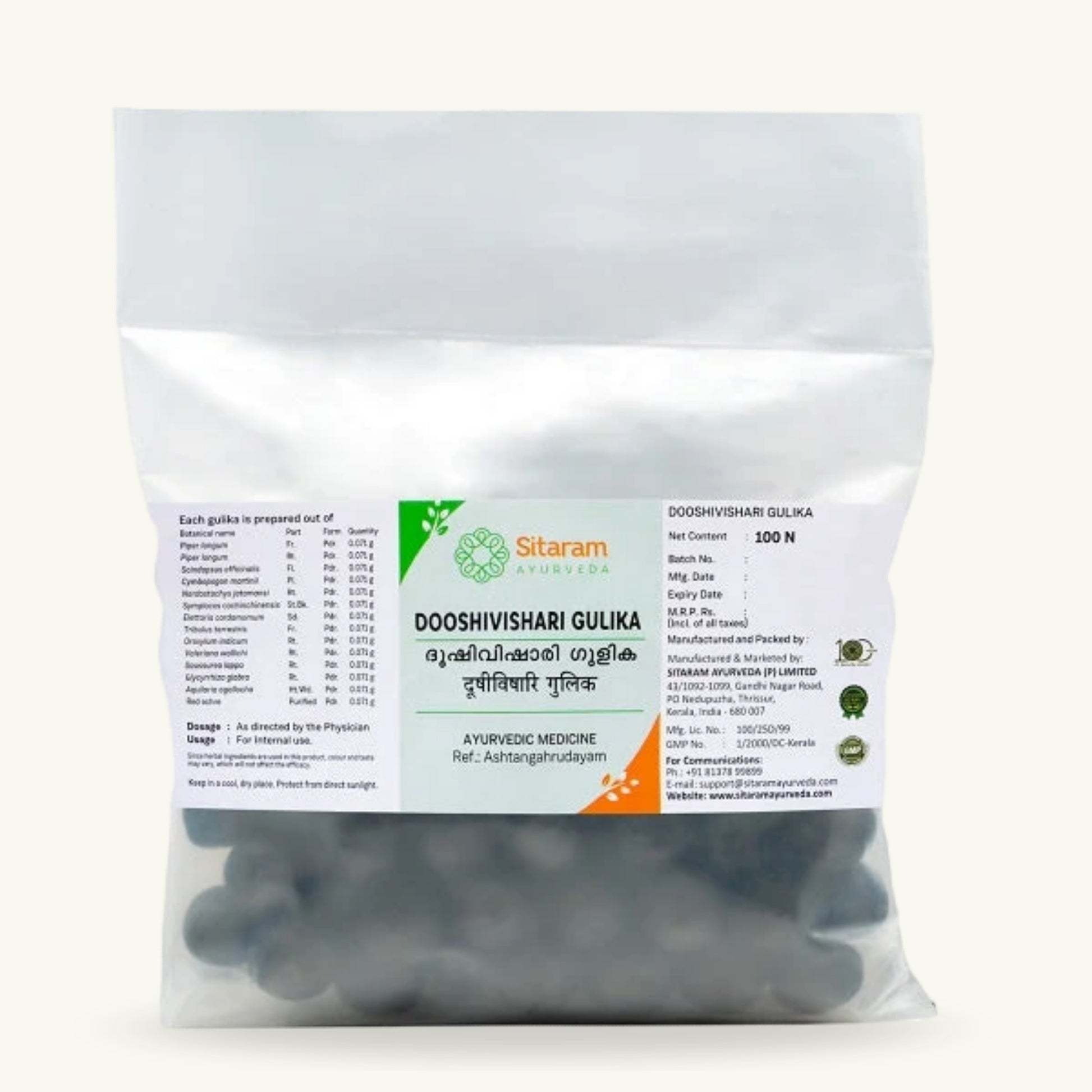 Dooshivishari Gulika is a classical Ayurvedic tablet prepared with a blend of traditional herbs and mineral preparations described in the texts. The formula brings together ingredients such as pippali, jatamamsi, lodhra, gokshura and sandalwood, which are traditionally valued in Ayurveda for balancing heat and supporting overall comfort.