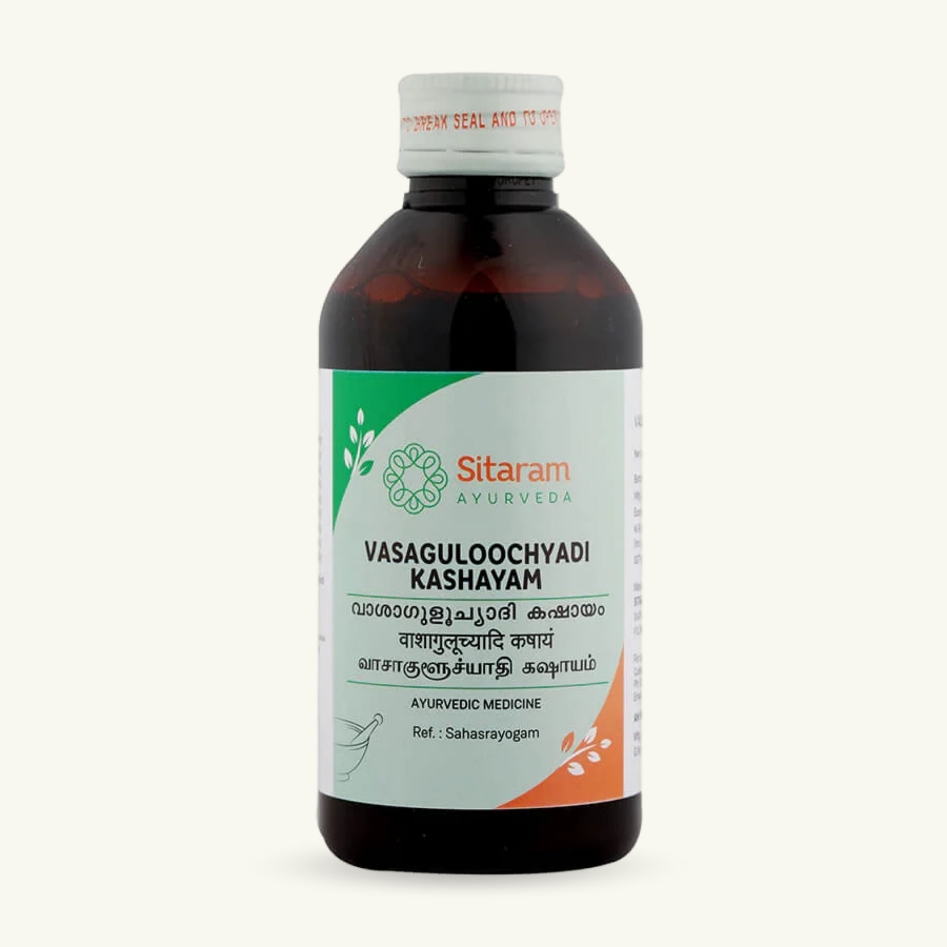Vasaguloochyadi Kashayam is a classical Ayurvedic herbal decoction prepared with Vasa, Guduchi and Triphala in a traditional kashayam process. It is taken as part of a daily wellness routine for those who wish to include a bitter, herb-based decoction in their lifestyle.